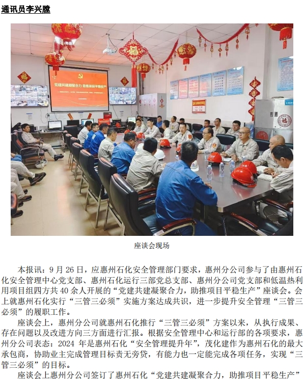 惠州分公司與業(yè)主開展 “黨建共建凝聚合力,助推項(xiàng)目平穩(wěn)生產(chǎn)”座談會(huì)